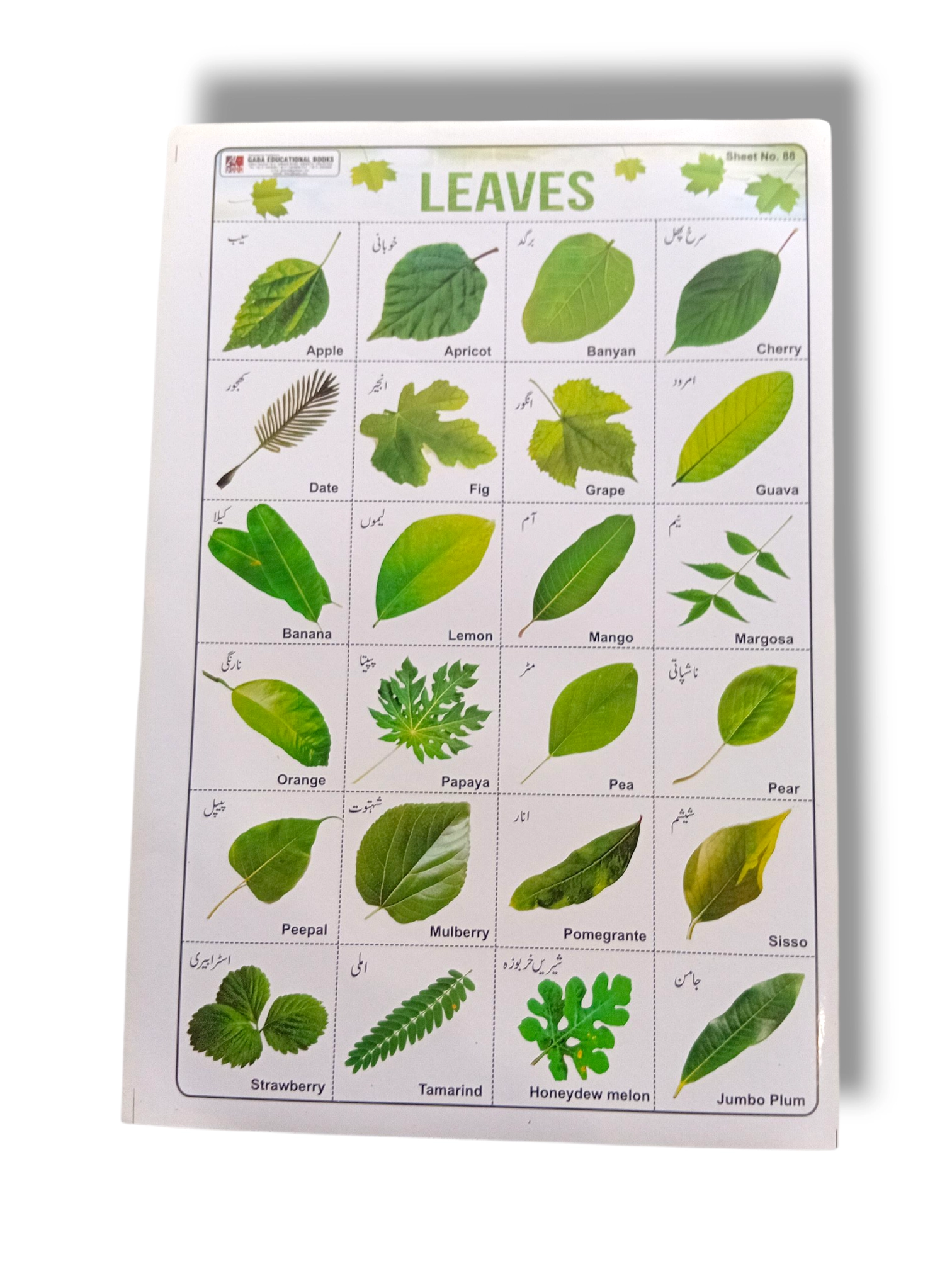 The Leaves Chart 88 is a vibrant educational tool designed to teach children about different types of leaves and plants. Featuring 88 clearly illustrated leaves, this chart helps students recognize leaf shapes, patterns, and types while improving observational skills. It is ideal for classrooms, libraries, homeschool environments, and kids’ study areas.